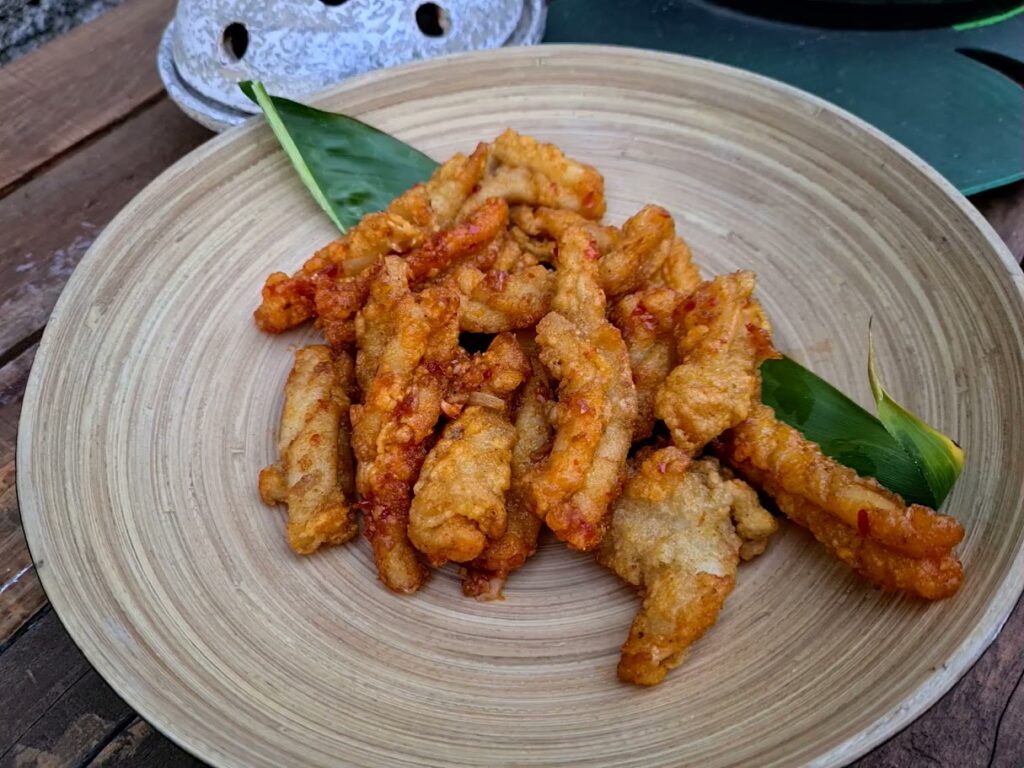 Égoutte un peu le poulet, puis mets-le dans un plat avec les pommes de terre pelées et coupées en morceaux.