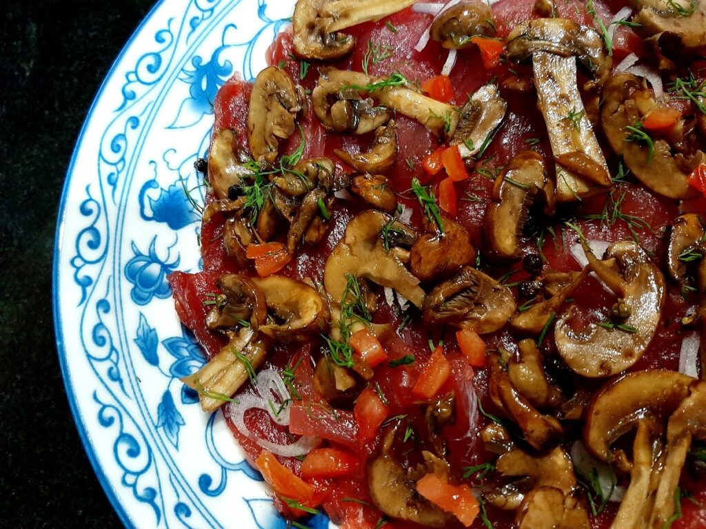 Coupe le pua’a rôti et les champignons en petits dés, râpe la papaye en julienne, hache le miri.