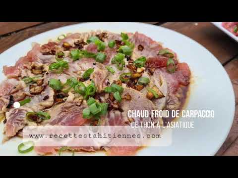 Un carpaccio de thon délicatement mi-cuit sous un filet d’huile de sésame chaude parfumée à l’ail. Le tout relevé de sauce soja, d'oignons frais et d’une pointe de croquant. Une recette simple, rapide, qui mêle finesse crue et chaleur subtile, inspirée des saveurs d’Asie et des tables polynésiennes.