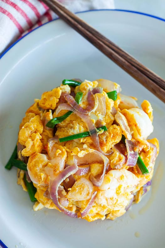 Verse les œufs battus par-dessus, puis ajoute les oignons verts.