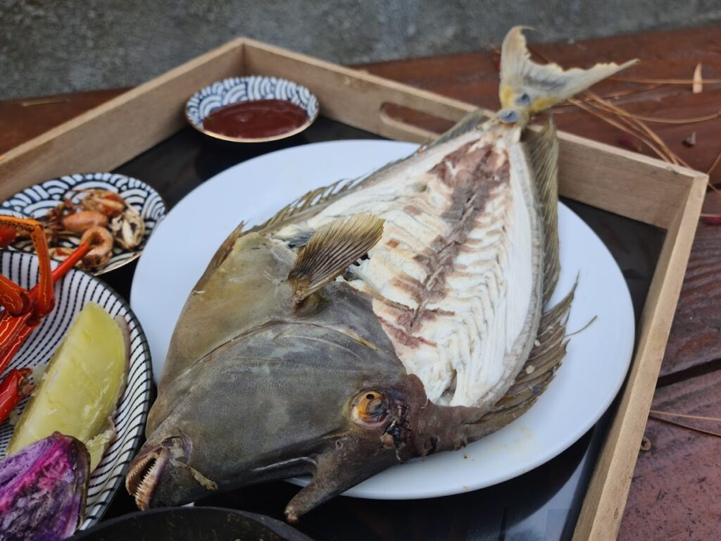 1. Nettoie et vide l’ume, puis rince-le rapidement. Enveloppe-le soigneusement dans une feuille de bananier ou de papier alu.